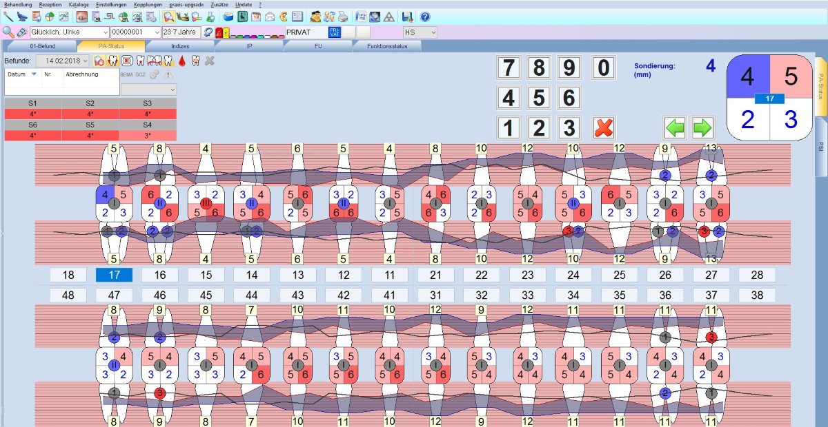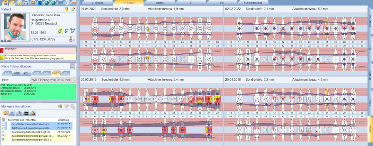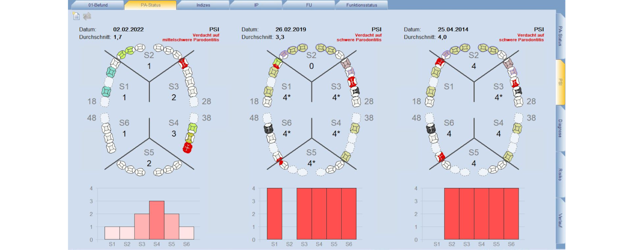 In dieser Erweiterung ist wahlweise die Eingabe der Rezession oder des Attachments möglich und sowohl das Risikodiagramm nach Lang und Tonetti, als auch das Fenster zur parodontologischen Diagnose sind im Programm eingebunden. Letzteres zeigt ein Screening der Taschentiefen und des Attachementniveaus inklusive deren prozentuale Verteilung und Berechnung von Durchschnittswerten. Die tiefste Messtelle wird im Befund noch einmal optisch hervorgehoben.